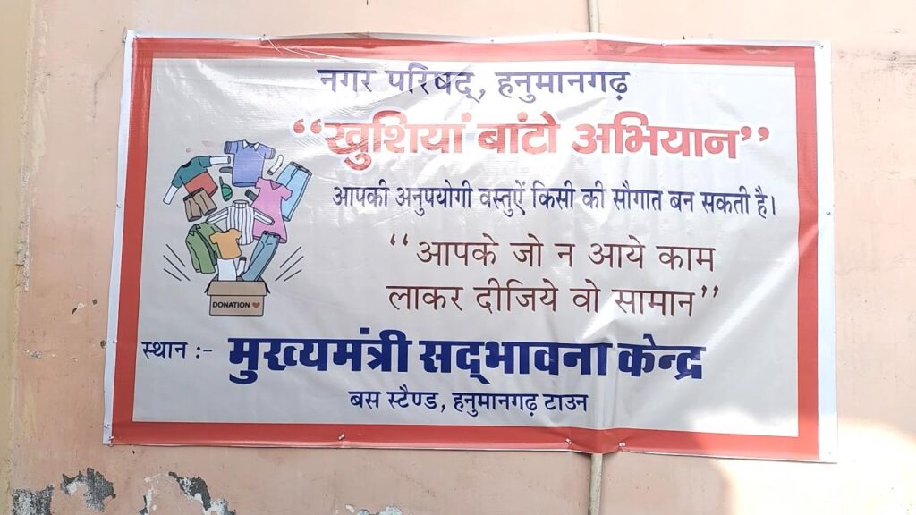 नगर परिषद आयुक्त सुरेन्द्र यादव ने बताया कि नगर परिषद की ओर से मुख्यमंत्री सद्भावना केन्द्रों में खुशियां बांटो अभियान चलाया जा रहा है। इसके अंतर्गत जिस भी व्यक्ति के पास रोजाना काम में आने वाली जरूरत की सामग्री जैसे कपड़े, बर्तन, बच्चों के खिलौने, किताबें सहित अन्य घरेलू सामान, जो उनके लिए उपयोगी नहीं है, वह व्यक्ति उस सामान को मुख्यमंत्री सद्भावना केन्द्र में जमा करवा सकता है। जरूरत अनुसार उस सामान की मरम्मत करवाई जाती है। उस सामान को जरूरतमंद व्यक्ति, परिवार मुख्यमंत्री सद्भावना केन्द्र से नि:शुल्क प्राप्त कर सकते हैं। इसके लिए उन्हें अपनी पहचान बताना भी आवश्यक नहीं है।