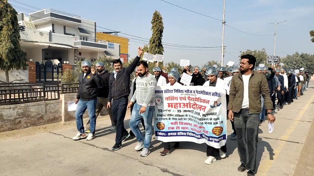 हनुमानगढ़। नियमित नर्सिंग ऑफिसर के 12 हजार एवं पैरामेडिकल के 4 हजार, एएनएम के 7 हजार पदों पर मेरिट एवं बोनस अंक के आधार पर नई नियमित भर्ती प्रक्रिया शुरू करने की मांग के संबंध में संविदा एवं निविदा पर कार्यरत नर्सेज व पैरामेडिकल कर्मियों ने गुरुवार को जिला मुख्यालय पर रोष मार्च निकाला। पैरामेडिकल भर्ती संघर्ष समिति एवं राजस्थान नर्सेज भर्ती संघर्ष समिति के बैनर तले स्वास्थ्य भवन (सीएमएचओ कार्यालय) से रवाना हुआ रोष मार्च जिला कलक्ट्रेट पहुंचा, जहां विरोध-प्रदर्शन करने के बाद मुख्यमंत्री एवं चिकित्सा एवं स्वास्थ्य मंत्री के नाम अतिरिक्त जिला कलक्टर को ज्ञापन सौंपा गया।
