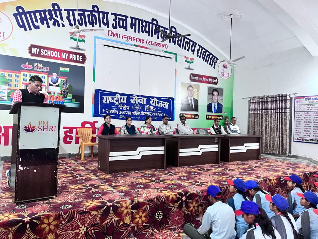 उन्होंने विद्यार्थियों को जल संरक्षण, पर्यावरण संतुलन और स्वच्छता के महत्व के बारे में जागरूक किया। उन्होंने कहा कि जल प्रकृति की अनमोल धरोहर है और इसका संरक्षण हर नागरिक की जिम्मेदारी है। कार्यक्रम अधिकारी अनिल बिश्नोई ने वर्तमान डिजिटल युग में बढ़ते साइबर अपराधों को ध्यान में रखते हुए विद्यार्थियों को साइबर क्राइम और साइबर फ्रॉड से बचाव के उपायों की जानकारी दी। उन्होंने इंटरनेट के सुरक्षित उपयोग, व्यक्तिगत जानकारी की सुरक्षा और ऑनलाइन ठगी से सतर्क रहने के लिए आवश्यक सावधानियों पर विस्तार से प्रकाश डाला। संस्था प्रधान सत्यदेव राठौड़ ने अपने संबोधन में एनएसएस की गतिविधियों और उसके उद्देश्यों पर विस्तार से जानकारी दी। उन्होंने विद्यार्थियों से नए शैक्षणिक सत्र में अधिक से अधिक नामांकन बढ़ाने का आह्वान किया और विद्यालय में उपलब्ध शैक्षणिक व सहशैक्षणिक सुविधाओं के बारे में भी बताया। शिविर के सफल आयोजन में व्याख्याता अल्का, अरविन्द कुमार, सतीश कुमार, रमेश कुमार, दीपक शर्मा, अजय प्रताप सिंह, उमेश कुमार, भगत सिंह डूडी, रेणु और राजीव कुमार का विशेष सहयोग रहा। समापन अवसर पर स्वयंसेवकों द्वारा आउटडोर और इनडोर खेल प्रतियोगिताओं का आयोजन भी किया गया, जिसमें विद्यार्थियों ने उत्साहपूर्वक भाग लिया। इन गतिविधियों ने टीम भावना, अनुशासन और स्वस्थ प्रतिस्पर्धा की भावना को बढ़ावा दिया। सात दिनों तक चले इस शिविर ने विद्यार्थियों में सामाजिक सेवा, सहयोग और जिम्मेदारी के संस्कारों को और मजबूत किया।