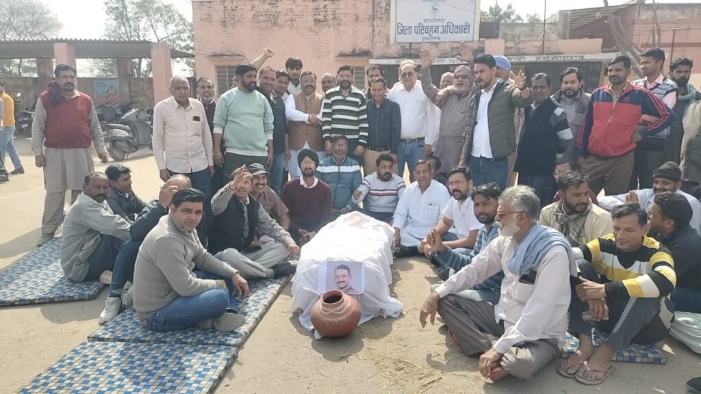 हनुमानगढ़। व्यावसायिक वाहनों की फिटनेस प्रक्रिया जिला मुख्यालय पर बंद किए जाने के विरोध में परिवहन व्यवसायियों का आंदोलन लगातार तेज होता जा रहा है। गुरुवार को तीसरे दिन भी ट्रक यूनियन, यातायात जन सेवा सलाहकार समिति, टैक्सी यूनियन, टेंपो यूनियन एवं बस एसोसिएशन के तत्वावधान में डीटीओ कार्यालय परिसर में बेमियादी धरना जारी रहा। इस दौरान इन संगठनों के सदस्यों ने प्रदर्शन कर राज्य के परिवहन मंत्री का पुतला दहन कर अपनी नाराजगी जाहिर की।
