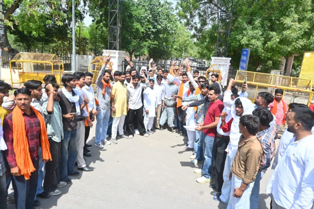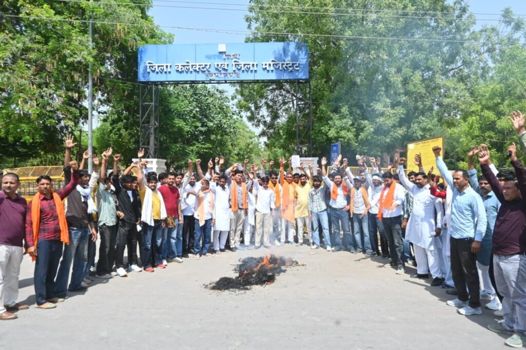 हनुमानगढ़। शहर में आज बजरंग दल के बैनर तले कार्यकर्ताओं ने देश में बढ़ रही कथित जिहादी मानसिकता एवं उससे जुड़ी गतिविधियों के विरोध में जोरदार प्रदर्शन किया। इस दौरान कार्यकर्ताओं ने पुतला दहन कर नारेबाजी की और अपना विरोध दर्ज कराया। प्रदर्शन के पश्चात कार्यकर्ताओं ने जिला कलेक्टर के माध्यम से महामहिम राष्ट्रपति के नाम ज्ञापन सौंपा। ज्ञापन में देश की आंतरिक सुरक्षा, सामाजिक समरसता और कानून व्यवस्था पर पड़ रहे प्रभाव को लेकर गंभीर चिंता व्यक्त की गई। ज्ञापन में कहा गया कि “लव जिहाद” जैसे मामलों का दायरा लगातार बढ़ रहा है और अब यह शिक्षित एवं व्यावसायिक क्षेत्रों तक पहुंच चुका है। साथ ही कुछ हालिया घटनाओं का उल्लेख करते हुए नाबालिग बालिकाओं के शोषण, ब्लैकमेल और जबरन धर्मांतरण जैसे मामलों पर कड़ी कार्रवाई की मांग की गई।