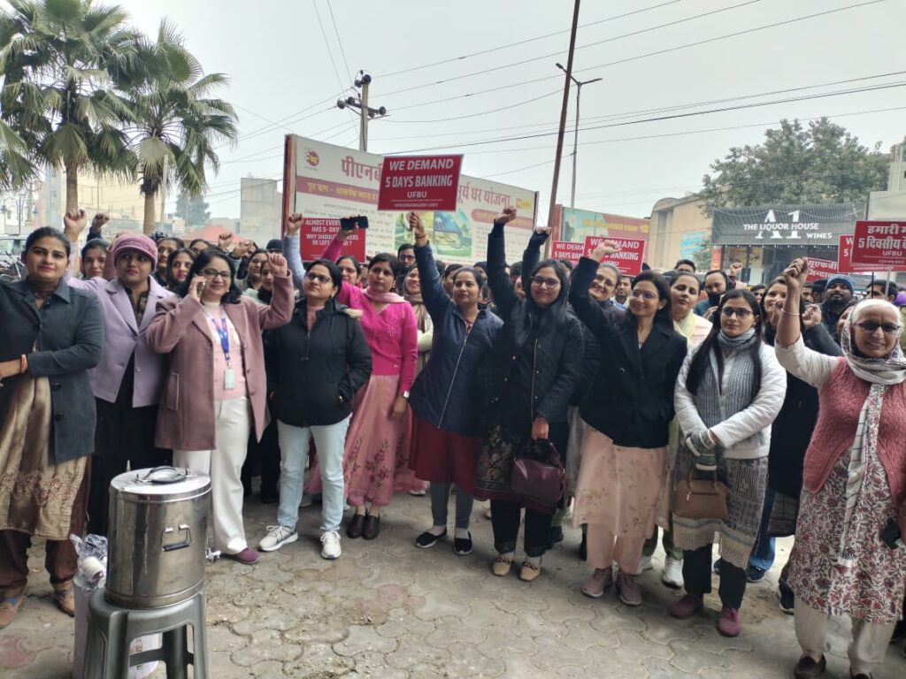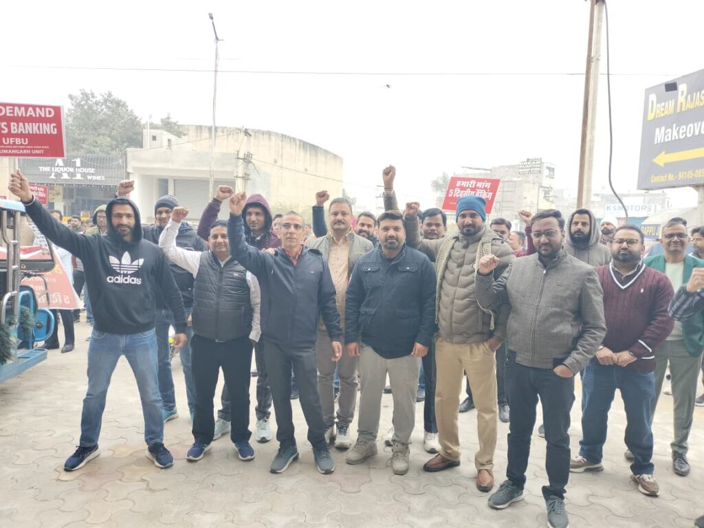हनुमानगढ़। यूनाइटेड फोरम ऑफ बैंक यूनियन (यूएफबीयू) के आह्वान पर मंगलवार को बैंक कर्मचारियों की देशव्यापी हड़ताल रही। इसके चलते हनुमानगढ़ जिले के सभी राष्ट्रीयकृत बैंकों में कामकाज पूरी तरह ठप रहा। बैंक बंद रहने से आम खाताधारकों, व्यापारियों, किसानों और पेंशनभोगियों को भारी परेशानियों का सामना करना पड़ा। हड़ताल का मुख्य कारण बैंक कर्मचारियों की लंबे समय से लंबित पांच दिवसीय कार्य सप्ताह (फाइव डे वीक) की मांग रहा। बैंककर्मियों का कहना है कि लगातार बढ़ते कार्यभार और मानसिक दबाव को देखते हुए अन्य सरकारी विभागों की तर्ज पर बैंकों में भी पांच दिवसीय कार्य सप्ताह लागू किया जाना चाहिए। सुबह करीब 10 बजे जंक्शन में टाउन रोड स्थित पीएनबी मंडल कार्यालय के मुख्य गेट पर जिलेभर के बैंक कर्मचारी एकत्रित हुए।