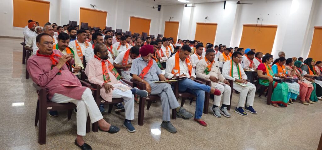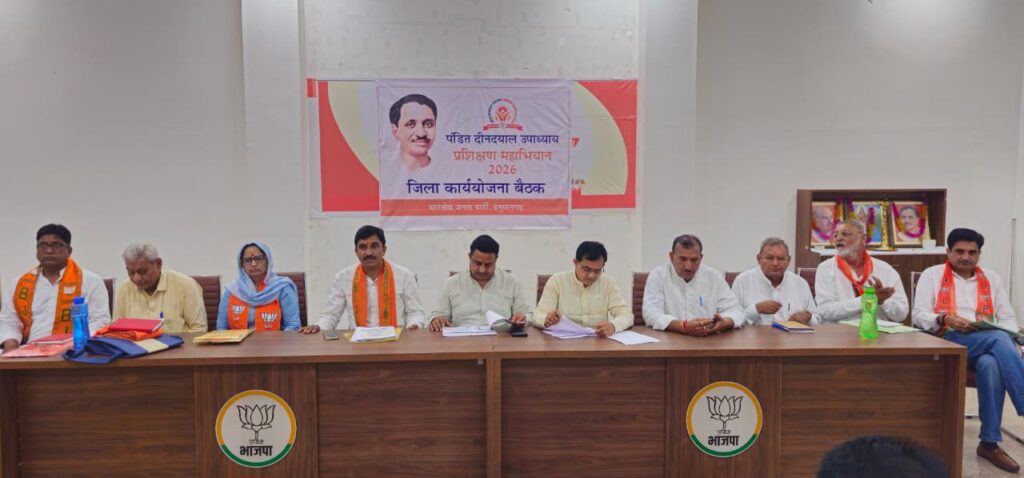 हनुमानगढ़। भारतीय जनता पार्टी की ओर से ‘पंडित दीनदयाल उपाध्याय प्रशिक्षण महा अभियान 2026’ के अंतर्गत जिला कार्य योजना की महत्वपूर्ण बैठक शुक्रवार को आयोजित की गई। बैठक की अध्यक्षता भाजपा जिलाध्यक्ष प्रमोद डेलू ने की। कार्यक्रम में मुख्य अतिथि के रूप में प्रदेश महामंत्री कैलाश मेघवाल, प्रदेश प्रकोष्ठ प्रभारी बिजेंद्र पूनिया तथा जिला संगठन प्रभारी दिनेश धाभाई उपस्थित रहे। बैठक के दौरान प्रदेश कार्यकारिणी में नव नियुक्त सदस्यों भारत भूषण शर्मा, काशीराम गोदारा, धर्मेंद्र कुमार मोची और दमयंती बेनीवाल का मंच पर स्वागत एवं अभिनंदन किया गया। इस अवसर पर पार्टी के पूर्व विधायक प्रत्याशी गुरदीप सिंह शाहपीनी, अमित चौधरी, प्रदीप एरी, जिला महामंत्री चरणदास गर्ग और नन्दलाल वर्मा भी मंचासीन रहे।