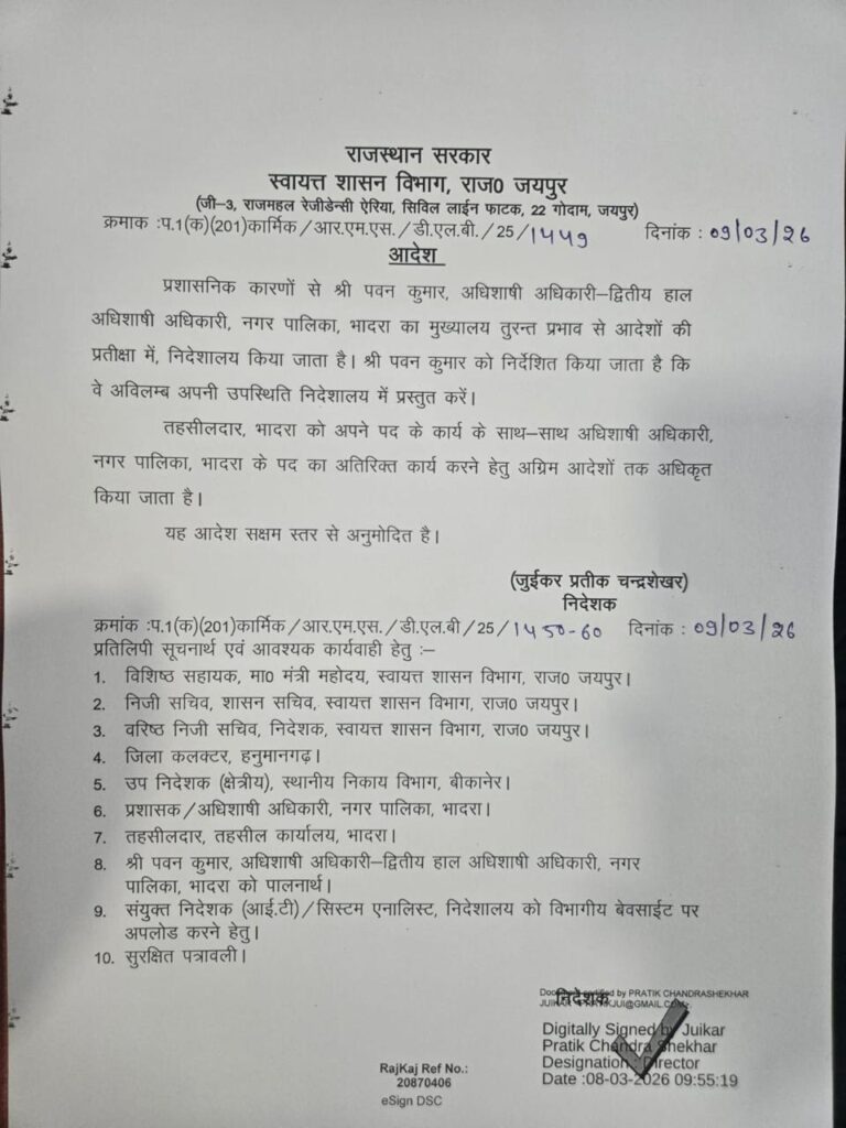 हनुमानगढ़। राजस्थान सरकार के स्वायत्त शासन विभाग ने प्रशासनिक कारणों से भादरा नगर पालिका के अधिशासी अधिकारी को तत्काल प्रभाव से पद से हटा दिया है। विभाग द्वारा जारी आदेश के अनुसार जयपुर स्थित निदेशालय से जारी निर्देशों में बताया गया है कि पवन कुमार, जो वर्तमान में भादरा नगर पालिका में अधिशासी अधिकारी (द्वितीय) के पद पर कार्यरत थे, उन्हें मुख्यालय से कार्यमुक्त करते हुए तुरंत निदेशालय में उपस्थित होने के निर्देश दिए गए हैं। स्वायत्त शासन विभाग के निदेशक द्वारा 9 मार्च 2026 को जारी आदेश में कहा गया है कि प्रशासनिक व्यवस्था बनाए रखने के लिए भादरा के तहसीलदार को अस्थायी रूप से नगर पालिका के अधिशासी अधिकारी का अतिरिक्त प्रभार सौंपा गया है। यह व्यवस्था आगामी आदेशों तक लागू रहेगी। आदेश की प्रतिलिपि हनुमानगढ़ जिला कलेक्टर सहित संबंधित अधिकारियों को भेजी गई है, ताकि आवश्यक प्रशासनिक कार्रवाई सुनिश्चित की जा सके। विभागीय सूत्रों के अनुसार यह निर्णय प्रशासनिक आवश्यकताओं को ध्यान में रखते हुए लिया गया है। स्थानीय प्रशासनिक हलकों में इस आदेश के बाद चर्चाओं का दौर शुरू हो गया है, वहीं नगर पालिका के कार्यों को प्रभावित न होने देने के लिए वैकल्पिक व्यवस्था तुरंत लागू कर दी गई है।