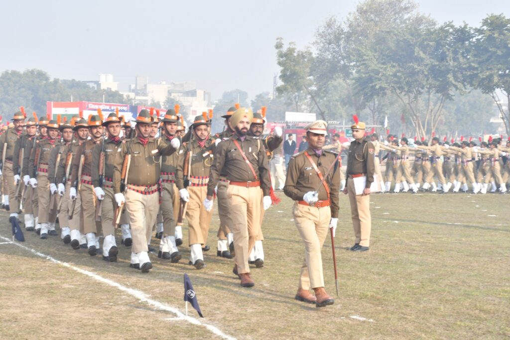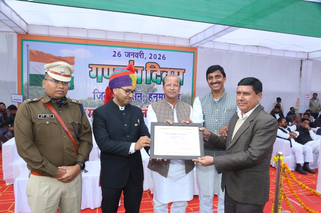 हनुमानगढ़। 77वां गणतंत्र दिवस जिले भर में सोमवार को गरिमापूर्ण और समारोह पूर्वक मनाया गया। जिला स्तरीय समारोह जंक्शन स्थित राजीव गांधी स्टेडियम में आयोजित हुआ। जिसमें मुख्य अतिथि जिला कलेक्टर डॉ. खुशाल यादव ने 9.15 बजे ध्वजारोहण कर कार्यक्रम की शुरुआत की। इससे पहले जिला कलेक्टर डॉ. यादव ने सुबह 8.15 बजे जिला कलेक्टर निवास पर और 8.30 बजे जिला कलेक्ट्रेट में ध्वजारोहण किया। सभी राजकीय कार्यालयों पर कार्यालय अध्यक्षों के द्वारा 8.30 बजे ध्वजारोहण किया गया। जिला स्तरीय समारोह में मुख्य अतिथि जिला कलेक्टर के अलावा पुलिस अधीक्षक हरी शंकर, हनुमानगढ़ विधायक गणेशराज बंसल, जनप्रतिनिधि प्रमोद डेलू, जनप्रतिनिधि अमित सहू, देवेंद्र पारीक, एडीएम उम्मेदी लाल मीना, बलवीर बिश्नोई, प्रदीप ऐरी, संजय शर्मा, सुरेंद्र तिवाड़ी, कृष्ण तायल, आशीष पारीक, ओम सोनी, नगर परिषद पूर्व चेयरमैन सुमित रणवां, हनुमानगढ़ एसडीएम मांगीलाल, सीईओ जिला परिषद ओपी बिश्नोई, डीएफओ सुरेश कुमार, सीएमएचओ डॉ. नवनीत शर्मा, सीडीईओ पन्नालाल कड़ेला, द्रोणाचार्य अवॉर्डी आरडी सिंह समेत बड़ी संख्या में गणमान्य लोग शामिल थे। जिला स्तरीय समारोह में मुख्य अतिथि जिला कलेक्टर डॉ. यादव द्वारा ध्वजारोहण करने के बाद राष्ट्रगान का आयोजन हुआ।