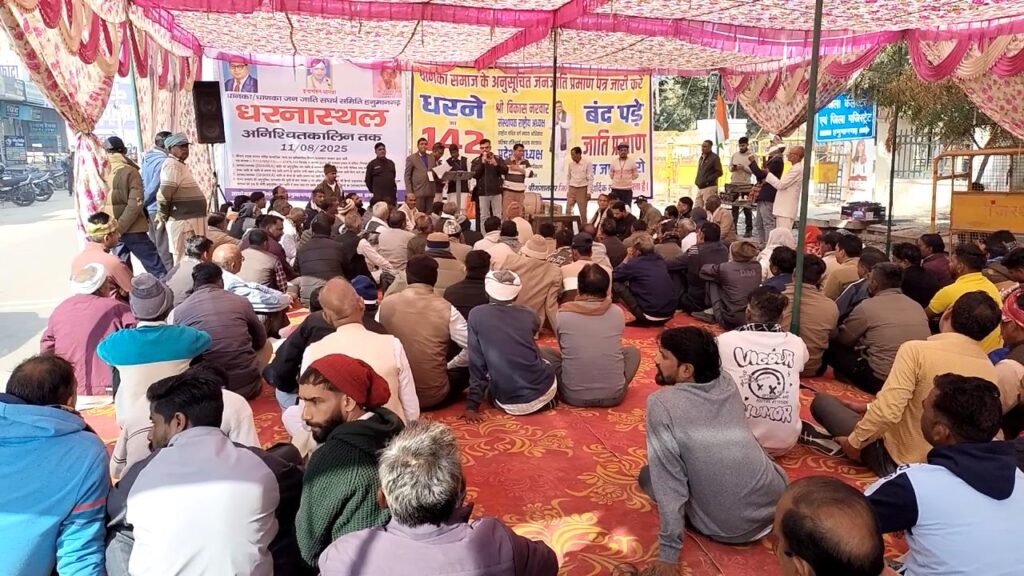 हनुमानगढ़। धाणका समाज के अनुसूचित जनजाति के प्रमाण पत्र जारी करने पर लगी रोक हटाने की मांग को लेकर धाणका/धानका जनजाति संघर्ष समिति का जिला कलक्ट्रेट के समक्ष बेमियादी धरना मंगलवार को 142वें दिन में प्रवेश कर गया। मंगलवार को धरनास्थल पर सभा का आयोजन किया गया। इसमें राष्ट्रीय वंचित वर्ग न्याय अधिकार परिषद के संस्थापक और राष्ट्रीय अध्यक्ष विकास नरवाल विशेष रूप से शामिल हुए। उनके नेतृत्व में समाज के प्रतिनिधियों की जिला कलक्टर के साथ वार्ता भी हुई। धरनास्थल पर हुई सभा में अमित कुमार ने बताया कि सरकार ने 2019 में एक चिट्ठी निकाली।