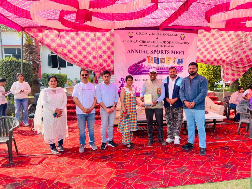 ऐलनाबाद। सी.आर.डी.ए.वी गर्ल्स कॉलेज और सी.आर.डी.ए.वी गर्ल्स कॉलेज ऑफ एजुकेशन के संयुक्त तत्वावधान में दो दिवसीय एनुअल स्पोर्ट्स मीट स्पर्धा 2026 का भव्य आयोजन किया गया। यह खेलकूद प्रतियोगिता प्राचार्य डॉ. भूषण मोंगा और एजुकेशन कॉलेज के प्राचार्य डॉ. रणजीत सिंह के कुशल दिशा-निर्देशों में असिस्टेंट प्रोफेसर गुरप्रीत कौर व सोनाली द्वारा आयोजित की गई ।इस खेलकूद प्रतियोगिता में छात्राओं ने अपनी खेल प्रतिभा का जमकर प्रदर्शन किया।कार्यक्रम के दौरान मुख्य अतिथि कोच (डेमोंस्ट्रेटर पोस्ट) प्रवीण कुमार पैरालंपिक खिलाड़ी ज्ञान सिंह व भगत सिंह स्कूल, संतनगर के प्राचार्य नवप्रीत सिंह उपस्थित रहे।