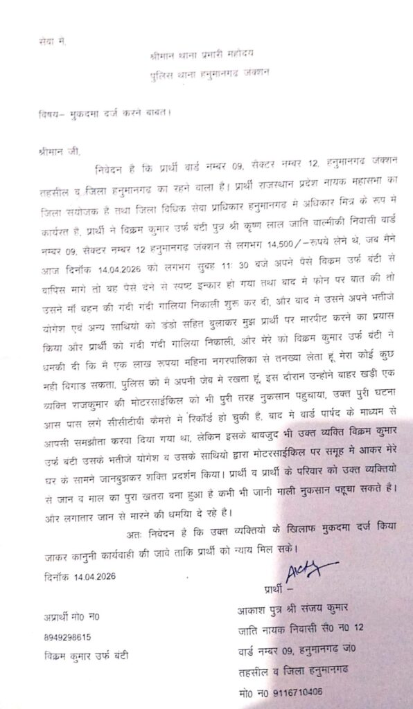 हनुमानगढ़। जिले के जंक्शन थाना क्षेत्र में उधारी के पैसे को लेकर शुरू हुआ विवाद अब गंभीर रूप ले चुका है। पीड़ित पक्ष ने आरोप लगाया है कि पैसे मांगने पर आरोपियों ने न केवल गाली-गलौज की, बल्कि मारपीट का प्रयास करते हुए जान से मारने की धमकियां भी दीं। इस संबंध में थाना प्रभारी को लिखित शिकायत देकर मुकदमा दर्ज करने की मांग की गई है।शिकायतकर्ता आकाश पुत्र संजय कुमार, निवासी वार्ड नंबर 09, सेक्टर 12, हनुमानगढ़ जंक्शन ने बताया कि उसने विक्रम कुमार उर्फ बंटी से लगभग 14,500 रुपये लेने थे। जब उसने 14 अप्रैल 2026 को सुबह करीब 11:30 बजे अपने पैसे वापस मांगे, तो आरोपी ने साफ तौर पर पैसे देने से इनकार कर दिया। इसके बाद फोन पर बातचीत के दौरान आरोपी ने कथित रूप से अभद्र भाषा का प्रयोग करते हुए गाली-गलौज शुरू कर दी। पीड़ित ने आरोप लगाया कि बाद में विक्रम कुमार ने अपने रिश्तेदार योगेश एवं अन्य साथियों को साथ लेकर उस पर हमला करने का प्रयास किया। इस दौरान आरोपियों ने पीड़ित को अपशब्द कहे और धमकी दी कि वह हर महीने नगरपालिका से एक लाख रुपये वसूलता है, इसलिए उसका कोई कुछ नहीं बिगाड़ सकता। पीड़ित का कहना है कि इस घटना के दौरान आरोपियों ने एक व्यक्ति की मोटरसाइकिल को भी क्षतिग्रस्त कर दिया, जिससे उसे आर्थिक नुकसान उठाना पड़ा। शिकायत में यह भी उल्लेख किया गया है कि पूरी घटना आसपास लगे सीसीटीवी कैमरों में रिकॉर्ड हो चुकी है, जो मामले की सच्चाई को स्पष्ट कर सकती है। घटना के बाद वार्ड पार्षद के माध्यम से दोनों पक्षों के बीच समझौता कराने का प्रयास भी किया गया, लेकिन इसके बावजूद आरोपी पक्ष का रवैया आक्रामक बना रहा।